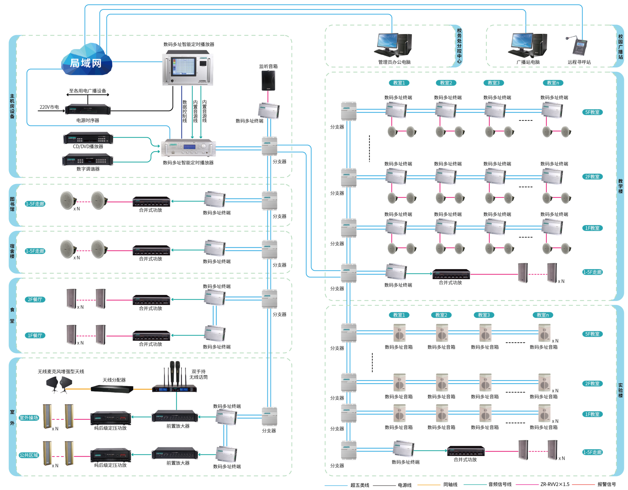 數(shù)碼多址公共廣播系統(tǒng)是以多個背景音樂通道,1個緊急通道為音源輸入,采用雙網(wǎng)線數(shù)字化傳輸方式,集中控制的可尋址廣播系統(tǒng)。該系統(tǒng)采用開放型架構(gòu),代替了傳統(tǒng)的模擬信號傳輸?shù)姆绞剑Y(jié)構(gòu)緊湊且可靈活組合,可拓展性強,穩(wěn)定可靠,節(jié)能環(huán)保。