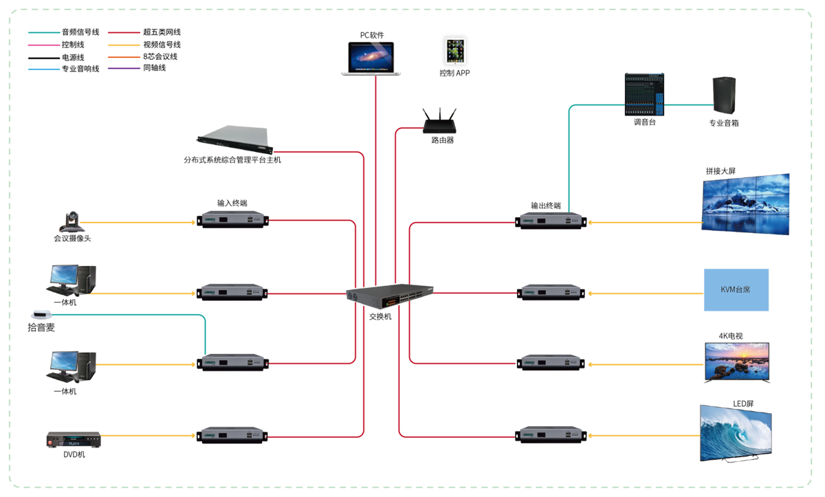 系統采用分布式架構部署,當其中的某個產品突發故障時,系統仍能正常運行。采用全新的視頻編解碼技術和無損傳輸方式,為客戶帶來了極致的音視頻體驗效果和可視化操作,實現了各區域間信號高清采集、無壓縮傳輸、高清還原、環境控制、互聯互通等功能,用戶只需通過觸控設備即可實時控制和調度不同區域的信號源,廣泛應用于會議、監控、多媒體信息發布和指揮調度等多種場所。
